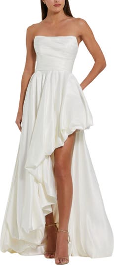 Modern and elegant, this strapless satin gown features ruched detailing and a dramatic high-low hem for a statement-making special occasion look.