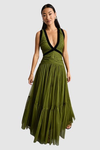Make a captivating entrance in this Warehouse Petite Velvet Trim Tulle Maxi Dress, designed for those who appreciate distinctive details. The plunging V-neckline framed with luxurious velvet trim creates a striking focal point, while the expertly ruched bodice sculpts and flatters.