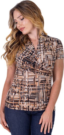 Add a stylish twist to your everyday look with this petite short sleeve wrap top. Designed with a flattering V neckline and overlapping wrap detail this top brings a touch of elegance to a casual silhouette. The soft stretch fabric ensures all day comfort while the eye catching print makes it easy to dress up or down. Perfect for pairing with jeans skirts or trousers this versatile top is a go to piece for both work and weekend wear.