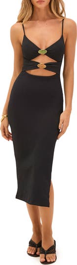 If your must step away from your pool chaise or beach towel, cover up with this sultry midi anchored by earthy sculptural accents defining the sassy cutout details.