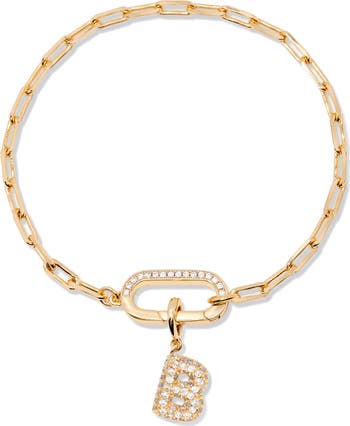 A sparkling pendant and carabiner amplify the contemporary elegance of a paperclip chain necklace plated in 14-karat gold.