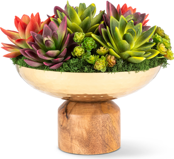 The Petra Succulent Wooden Pedestal Arrangement combines the rich elegance of a wooden pedestal with a luxurious gold bowl, holding a thoughtfully arranged blend of succulents in a variety of natural hues. This arrangement exudes both modern sophistication and organic charm, making it a striking addition to any space. A lasting luxury, timeless and unrivaled.