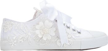 Congratulations on your big day! If you're looking for a comfortable yet glamorous option for your wedding shoes, Peyton Bridal Sneakers from Forever & Always Shoes are the perfect fit for you. These low-top bridal sneakers feature a 1.2-inch outsole height (3 cm). The white upper is adorned with meticulously handcrafted floral lace, adding an elegant touch to every step you take. The satin ribbon laces enhance the glam of these bridal sneakers, making them a perfect choice for any bride who wants to be comfortable and glamorous on her special day. Whether you're looking for a unique way to express your style or simply want to keep your feet comfortable during your wedding reception, these lace wedding trainers are a perfect choice. These shoes are designed to fit true to size, so we recommend ordering your regular size.