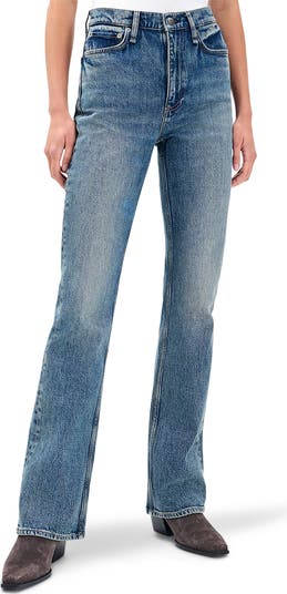 Crafted from low-stretch denim with an authentic rigid look, these full-length bootcut jeans are aged with sanding and tacking for casual-cool style.