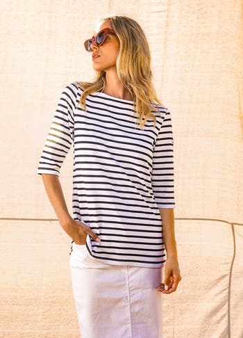 Striped tunic with 'bateau' neckline and ¾ length sleeves in our exclusive Anti-UV Skin-Protection microfiber material. Side slits. UV sun protection: using the U.V Skin-Protection microfiber, SAINT JAMES offers a specially designed garment to protect your body against harmful solar rays. This polyamide microfiber offers a skin protection twice as high as cotton. You will also appreciate its easy-care, drying, and active breathing properties. It also does not pill.