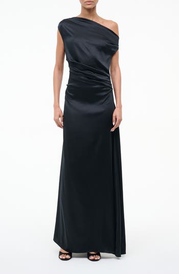 Cut from luxe, lustrous stretch silk, this glamorous gown is made in a shoulder-showing silhouette and accented with rippled waistline ruching.