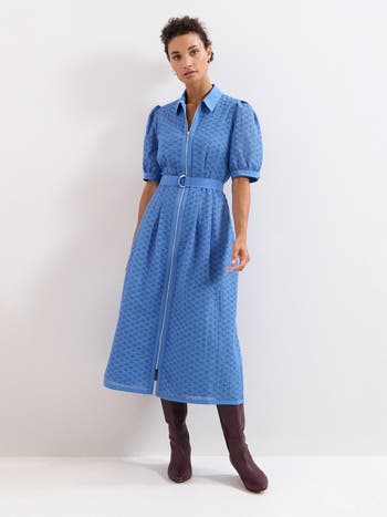 This gorgeous midi dress features a unique textured pattern, short, puffed sleeves and a zip front detail. Wear with heels, sandals or trainers for an elevated look that will see you from office to weekends.