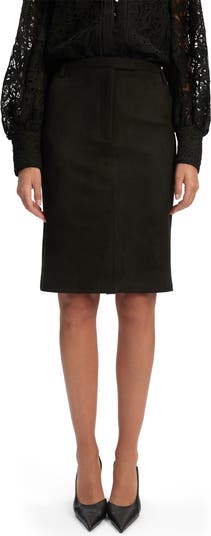 Smooth faux-suede composition adds just the right amount of poise to this classic pencil skirt featuring a sleek back vent for ease of movement.