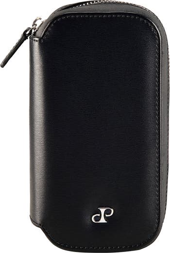 - Black grained vegan leather Lining black Ultrasuede 2 padded watch storage areas Silver finish hardware and DP Logo
