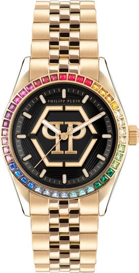 A polished finish adds a glow to this stunning bracelet watch styled with a guilloche dial, luminous hands and indexes and multicolor crystals at the bezel.