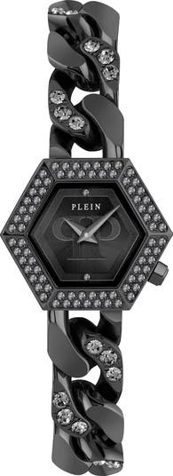 This hexagon-shaped watch is a mix of chic style and subtle detail with sparkling crystals illuminating the sunray dial, bezel and polished link bracelet.