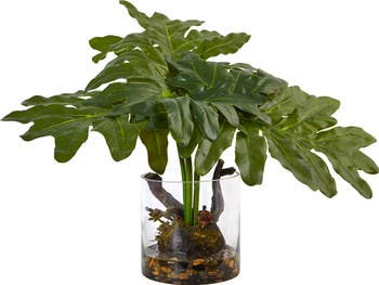 Small but stately, Philodendron Selloum leaves are handcrafted with texture and perfected in a glossy finish for a life-like appearance. Sitting stately in a glass vase, faux water and river rocks prop bright green stalks to offer maintenance and mess free care. Place with coffee table books and geometric paperweights for a contemporary feel.