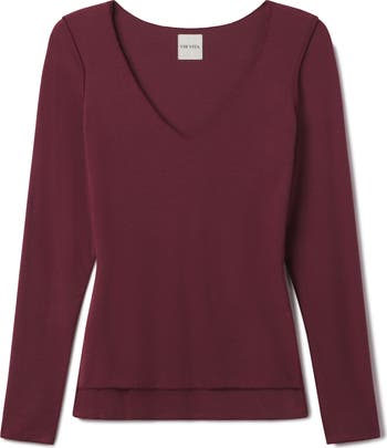 This long sleeve v-neck top is made from our signature knit, featuring a double-lined design for a soft and luxurious feel. Versatile and timeless, it's a must-have for any wardrobe. Crafted from medium weight baby rib for comfort and durability.