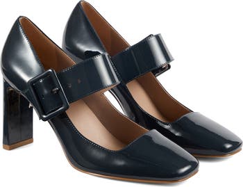 A timeless mary jane is reimagined in this glossy leather pump outfitted with an oversized buckle, slender heel and square toe.