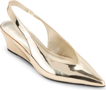 A metallic finish gives a high-shine update to a chic pointy-toe pump balanced by a low wedge and pointy toe.