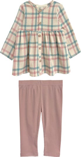 The Phoebe two piece set effortlessly combines playtime with everyday comfort. Featuring a soft plaid top in delicate hues of pink, blue, and cream, this design boasts a gently flared waistline and five wooden buttons for easy dressing. Paired with cozy, muted pink leggings for a snug fit, this outfit is perfect for stylish, carefree days your little one will love.