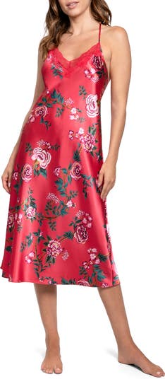 Scalloped lace trims the neck of a smooth satin nightgown printed with bright flowers and seamed for a graceful curve-skimming fit.