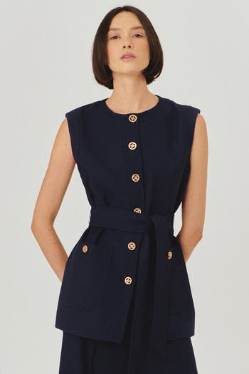 The Slim Fit Textured Vest with Gold Button Details, Waist Tie, and Pockets combines practical pockets, a waist-defining detail, and a slim silhouette. It adds a clean layered look that feels polished and versatile.