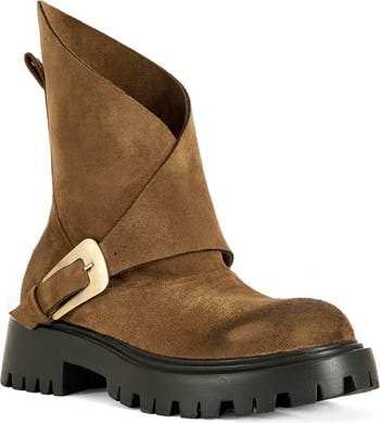A hearty lug sole firmly grounds this bootie topped with a retro-futuristic wrap shaft.