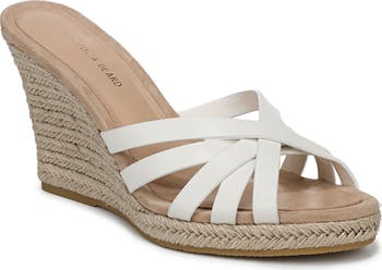 Espadrille-inspired braiding accentuates the wedge heel of this strappy and sophisticated sandal.