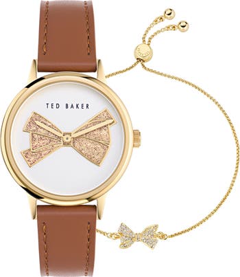 A glitter-encrusted 3D bow illuminates the dial of this smooth leather-strap watch paired with a dazzling bracelet that can be worn alone or stacked.