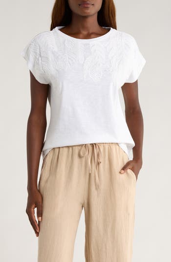 Lounge in the cool, breezy shade of waving palm trees anywhere you go in this elegantly embroidered top finish with the briefest of arm-baring cap sleeves.