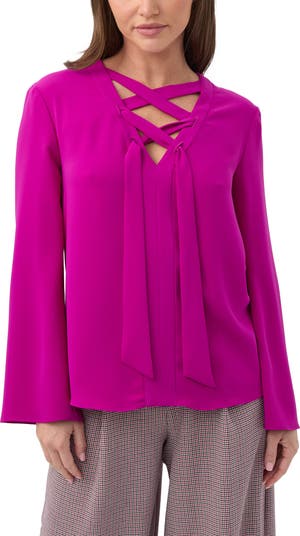 Easy fitting blouse with long flared sleeves and a lace up neckline