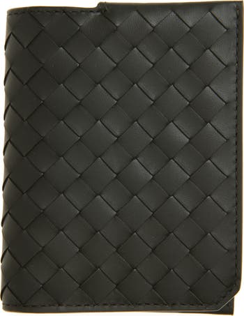 The brand's iconic intrecciato weave—crafted from handwoven strips of grained Italian calfskin—distinguishes this richly textured bifold wallet.