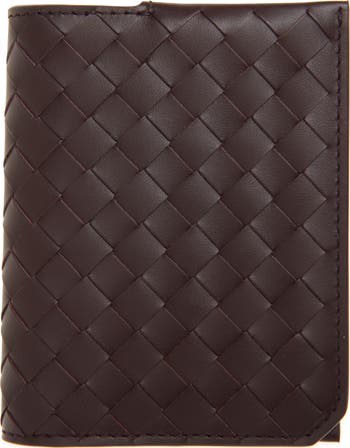 The brand's iconic intrecciato weave—crafted from handwoven strips of grained Italian calfskin—distinguishes this richly textured bifold wallet.