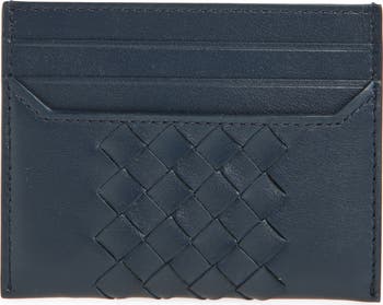 The brand's iconic intrecciato weave—crafted from handwoven strips of grained Italian calfskin—adds rich texture to this slim card case cast in a Neptune-inspired hue.
