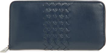 The brand's iconic intrecciato weave—crafted from handwoven strips of grained Italian calfskin—adds rich texture to this capacious zip wallet cast in a Neptune-inspired hue.