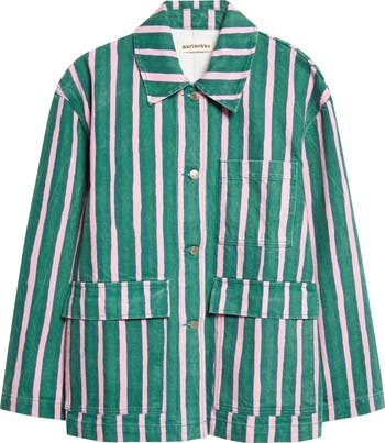 Dropped shoulders enhance the relaxed silhouette of this durable cotton jacket cut in a longline silhouette and covered in lively stripes.