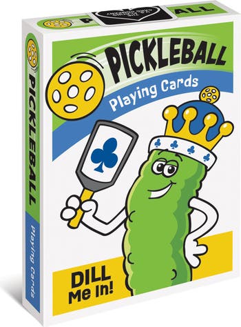 PLAYING CARDS: PICKLEBALL - DILL me in! Grab some friends for a hand of cards with this pickleball-themed standard playing card deck. Use the cards as you would any other standard deck, OR play our exclusive Pickleball Card Game with the included instructions. This thrilling game captures much of what you like about the actual game itself. Either way, you'll have a DILL-ightful time! Suitable for all ages and abilities; easy to read characters and suits. Sturdy storage box includes 52 durable playing cards, 2 jokers, 2 information cards including QR code link for instructions for 2 or 4 players. Cards are great for helping kids learn good sportsmanship, patience and social interaction. Built to last, each card features an air-cushion finish for smooth shuffling and comfortable handling. The deck is printed on durable, high-grade stock that holds up through countless games. Includes 52 standard suit cards, 2 jokers, and 2 info cards—everything you need for classic play and more. Standard playing card size (3.47" x 2.47"); made in USA.