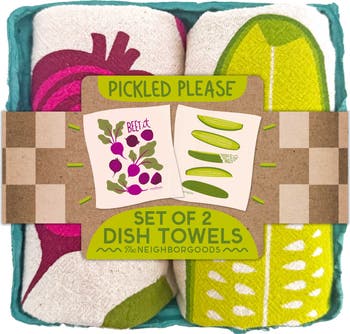 Brighten your kitchen with our Pickled Please Towel Set, featuring two of our signature 100% cotton dish towels: Beet It and Big Dill Pickle. Bundled in a gift-ready, biodegradable produce container and topped with our sleek NEW branded belly band, this set is as cute as it is practical. Made from all natural, unbleached cotton and screen-printed with eco-friendly inks, these towels are soft, absorbent, machine washable, and gentle on the planet. They’ll add personality to any kitchen and bring you a smile. Perfect for holiday gifting, birthdays, housewarmings, and more! They also make adorable (and sustainable) gift wrap too.