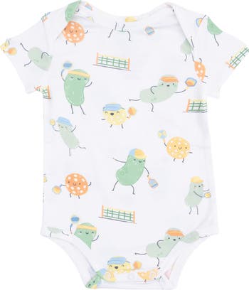 Pickleball playing pickles pattern this supersoft bodysuit with snaps between the legs for easier diaper checks and changes.