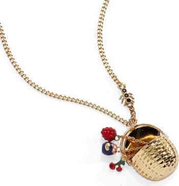 Bring the sunshine wherever you go with this playful picnic basket pendant necklace. Featuring a crystal pave bail, faceted curb chain, and hidden magnetic closure, the dimensional basket opens to reveal a colorful cluster of fruit charms for a charming little surprise. A sparkling ant detail sits neatly along the chain for a cheeky seasonal touch. With its longer length (30" + 2" extender), this piece layers beautifully or makes a statement on its own, perfect for warm-weather days, outdoor adventures, or just channeling picnic vibes anytime.