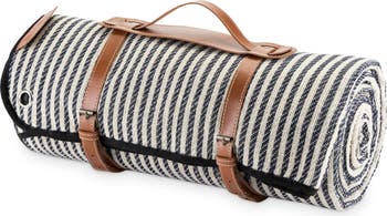 With its nautical pinstripes and waterproof lining, this blanket calls for a romantic picnic under a shady tree or a sunny lunch at the beach. A genuine leather carrier and four picnic stakes are conveniently included for a carefree outdoor date.