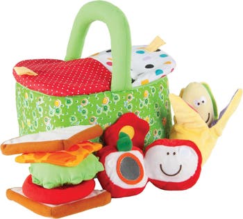 18 months & up. Have a wonderful lunch with this soft Picnic Lunch Dramatic Play Food Set with Storage Basket. This soft outdoor lunch set is complete with a crinkly banana, apple with mirror, squeaky sandwich, and crinkly lettuce. The basket has an attached handle and lid for storing food. This set promotes color recognition, sensory learning, and dramatic play. Surface washable only.