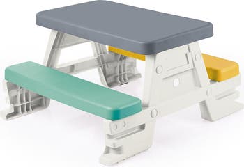 PICNIC TABLE FOR 4: WHITE, GREEN, YELLOW - Designed to ignite your child's creativity and engagement, this table is the perfect platform for a wide range of activities, from imaginative role play to arts and crafts adventures. Crafted with durable, weather-resistant plastic, this table is built to withstand both indoor and outdoor play, allowing your child to enjoy their favorite activities wherever they please. Whether it's in the cozy confines of the playroom or the sprawling expanse of the backyard, the fun never has to end. Measuring approximately 30 inches in length, 28 inches in width, and 17 inches in height, this table provides ample space for up to four children to interact and play together. It's not just a play surface—it's a social hub, fostering important social skills and encouraging collaborative play that creates unforgettable moments of fun and friendship. But this table isn't just about fun and games—it's also an educational tool. With a focus on literacy and spatial awareness, it enriches your child's learning experience while they engage in play. Watch as they explore, discover, and learn through hands-on activities that stimulate their minds and inspire their imaginations. And because we know that playtime can sometimes get a little messy, we've made sure that this table is as durable as it is fun. Made from sturdy plastic, it can withstand even the most energetic play sessions and can be easily wiped clean with a dry cloth, ensuring a long-lasting and hygienic playtime environment for your little one. So why wait? Provide your child with a space where imagination knows no bounds. Whether they're building forts, hosting tea parties, or creating masterpieces, our versatile play table is the perfect setting for endless hours of fun, learning, and unforgettable memories.