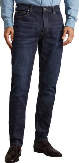 An indigo wash with sanding and whiskering furthers the versatile appeal of jeans made from stretch-hinted denim in a fit that stays slim from hip to hem.