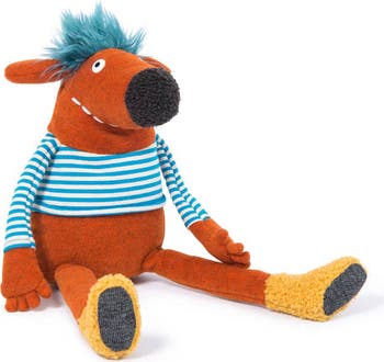 From The Schmouk collection, “Pidou” in orange fleece, both hilarious and endearing with his big nose in fur fabric and his blue messy hair. He wears a white and blue striped jersey t-shirt and little boots in mustard-colored fur. His outfit matches the wonderfully eccentric style of the Schmouk characters.