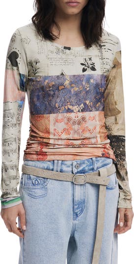 Musical notes, love letters and pretty patternwork are pieced together to create the eclectic look of this ruched T-shirt cut from a stretch-enhanced knit that's so soft and comfortable it won't have time to migrate to the bottom of your stack.