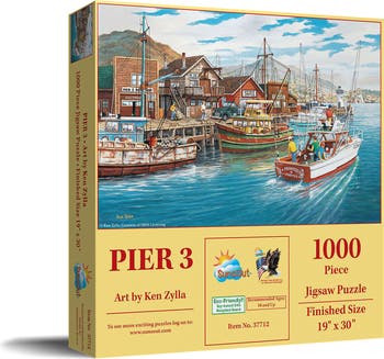 Engage your imagination with the Pier 3 1000 Piece Jigsaw Puzzle by SunsOut, featuring serene sea life art by Ken Zylla that transports you to a quaint and colorful harbor. Made in the USA, SunsOut puzzles are crafted from high-quality recycled cardboard with interlocking pieces that fit seamlessly together, making for an uninterrupted and enjoyable puzzling experience. The use of vibrant, soy-based inks not only enhances the puzzle's scenic artwork but also reflects a sustainable manufacturing approach. Customer satisfaction is paramount with SunsOut, guaranteeing swift resolution for any missing or damaged puzzle pieces. As a proudly woman-owned American company, SunsOut uses eco-friendly materials and supports quality local production. The Pier 3 puzzle is not merely a game but an artistic exploration, a tranquil escape, and a therapeutic process wrapped into one. Measuring 19" x 30", the puzzle depicts a serene pier, inviting adults to indulge in a mindful escapade from the everyday. Perfect for cozy nights or a mindful afternoon, this puzzle promises an enriching experience that speaks to your artistic soul.