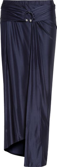 Julien Dossena takes a softer—yet equally alluring—approach to Rabanne’s signature shine with this fluid jersey midi skirt, where crystal-studded ring hardware pierces an artfully draped sash in a dazzling focal point.
