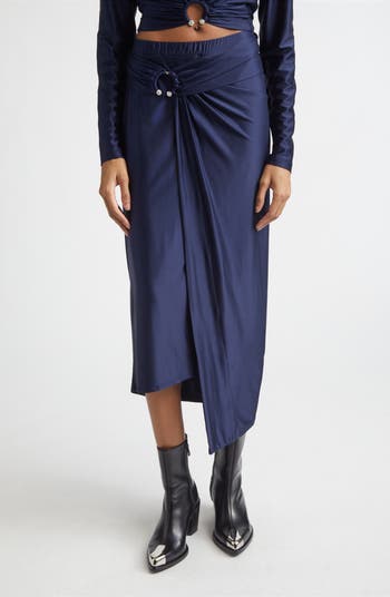Julien Dossena takes a softer—yet equally alluring—approach to Rabanne’s signature shine with this fluid jersey midi skirt, where crystal-studded ring hardware pierces an artfully draped sash in a dazzling focal point.