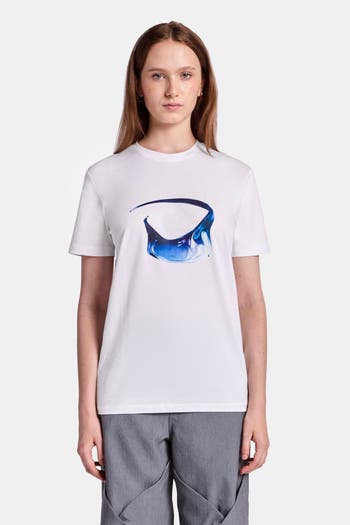 White Unisex Short Sleeve T-shirt in soft Pima Cotton Jersey. This classic crew neck tee has finely ribbed trim, and a straight-cut hem, featuring our iconic Kate Barton Pierced Glass Bag print. Made in NYC.