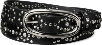 Lustrous studs and an elongated oval buckle glint against the smooth leather of a fierce belt that adjusts for the perfect fit.