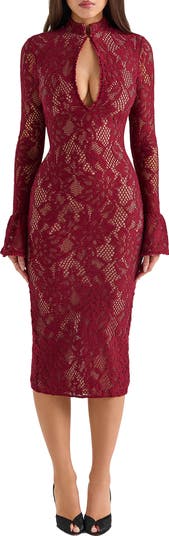 Dominate the party circuit in an all-lace dress cut to serve every curve and centered with a daring cutout.