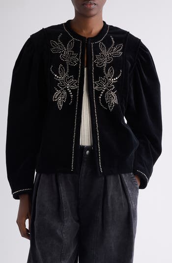 Rich cotton velveteen is the perfect foil for the silvery floral stud design of this boxy puff-shoulder jacket meant for causal pairings.