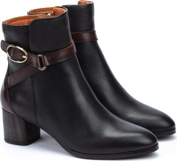 A slender buckle strap wraps around the shaft of a leather bootie balanced upon a study block heel.